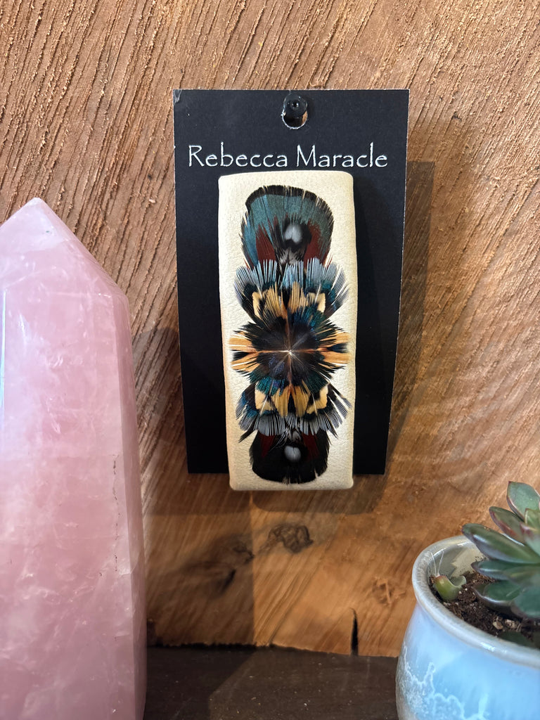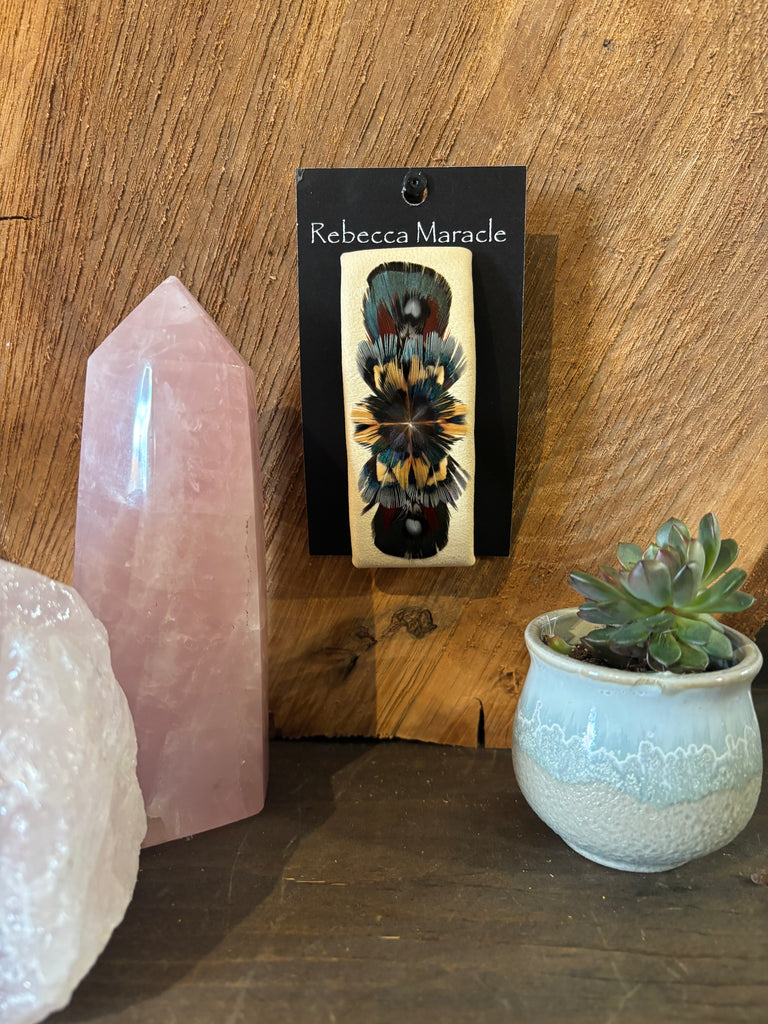 Created on a leather back with a 3" barrette clip. Each one is original and involves plucking, clipping and positioning Pheasant feathers to create each pattern.